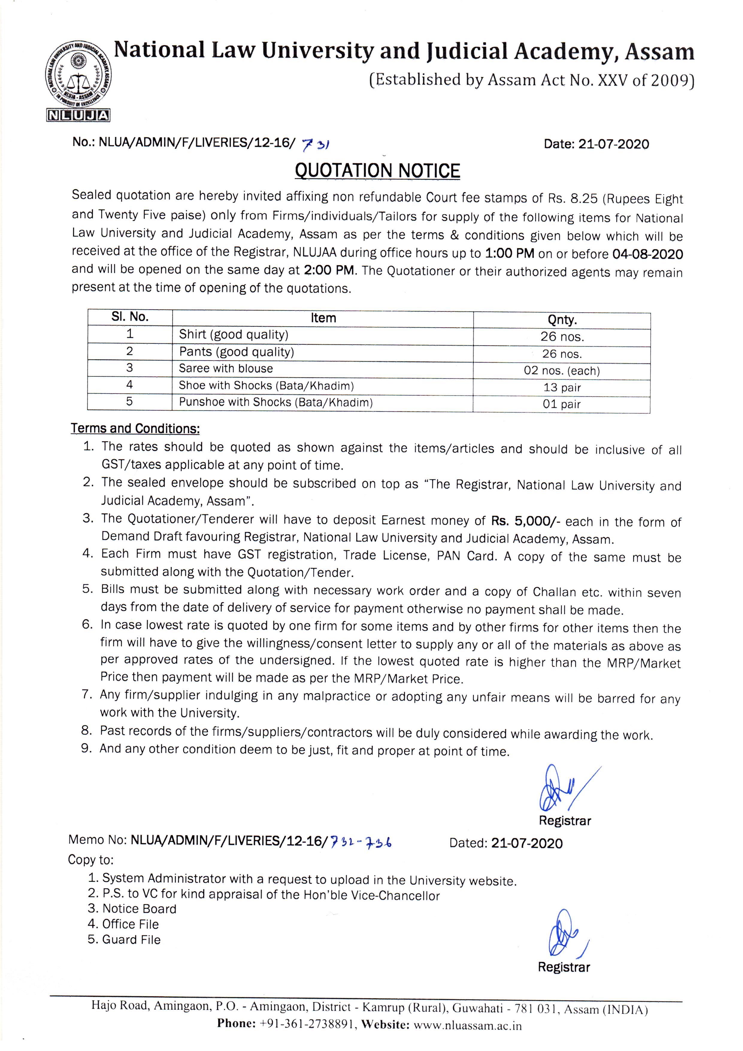 Advt No.: NLUJAA/ADMIN/F/OFFICE STATIONERY-TONER/2021/04/201